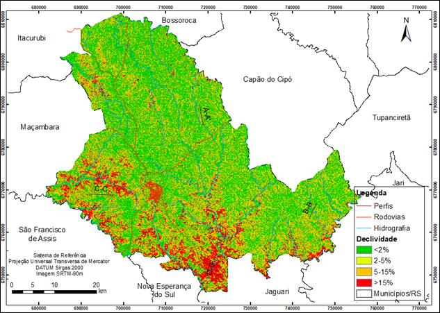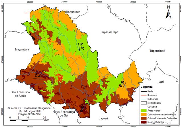 A relação entre as declividades e a amplitude definiu as formas de relevo do município de Santiago (FIGURA 5) em: áreas planas, colinas suavemente onduladas, colinas fortemente onduladas e formas de morros e morrotes associadas.
