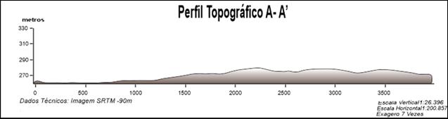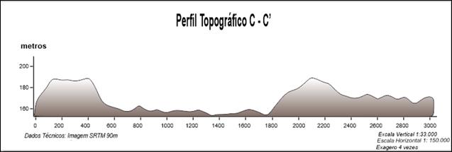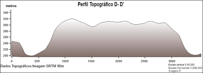 O perfil topográfico D-D’(figura9) está localizado ao sul do município, apresenta uma extensão de 3km, mostra uma amplitude altimétrica de 120, estando no interflúvio do Rio Jaguarizinho.