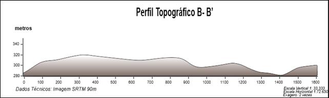 Colinas Suavemente Onduladas: Esta unidade de relevo ocorre associada às áreas planas na porção central do município e nos extremos NW e NE. As formas de colinas suavemente onduladas caracterizam-se por amplos interflúvios, declividades entre 2 e 5 % e amplitudes entre 20m e 40m, observado no perfil topográfico B-B’ figura 7.