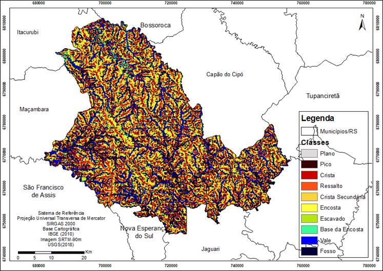 Os elementos de relevo foram definidos com base nos trabalhos de Silveira et al (2017) que utilizam o Índice de posição topográfica (IPT) e, especialmente, o estudo de (JASIEWICZ; STEPINSKI, 2013)), que desenvolve uma metodologia, aplicada por Robaina et al. (2017), que classifica os elementos de relevo através do emprego de ferramentas de visão computacional, estabelece parametrização automatizada nos denominados geomorphons.