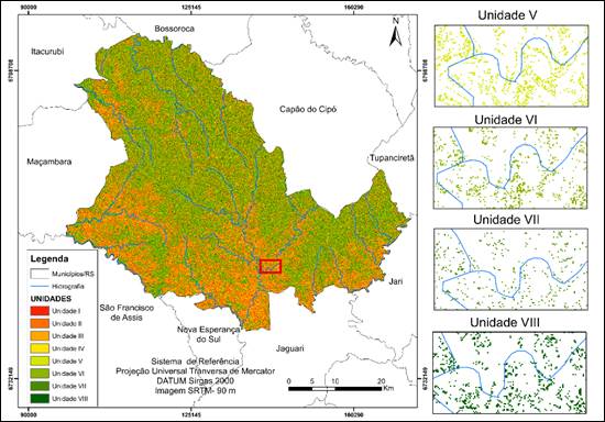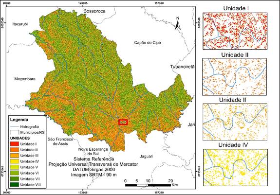 Figura 12 – Representação espacial das unidades geomorfométricas no município de Santiago/RS com detalhes para as unidades V a VIII