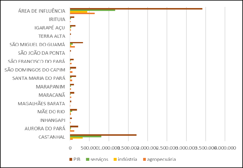 A agropecuária é o principal setor econômico na maior parte dos municípios sob influência de Castanhal e, mesmo assim, não é a principal atividade da área de influência por conta da força do comércio e dos serviços concentrados em Castanhal. Com um PIB de R$ 1.719.548.000, o município é responsável por 50% do PIB de toda a sua área de influência, que é de R$ 3.412.047.000. (Figura 4)