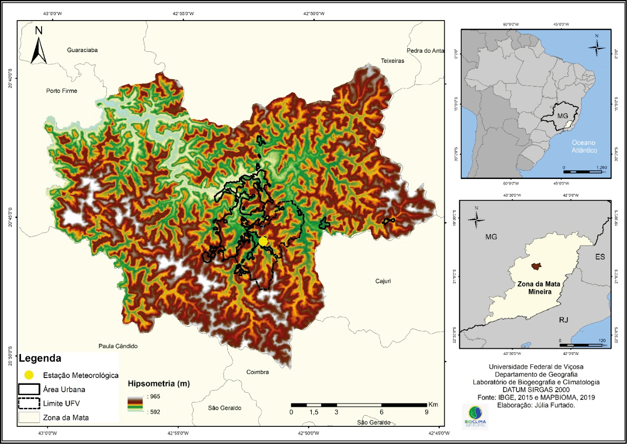O município de Viçosa (MG) está localizado na porção central da Zona da Mata Mineira, divisa com o Estado do Rio de Janeiro, com uma área total de 299,418km², altitude de 649 metros, e se insere, segundo Ab’Saber (2003), no domínio morfoclimático de mar de morros florestados (Figura 1). O nome atribuído ocorre em função das feições do relevo, que apresentam morros arredondados ou mamelonares, com destaque para a Serra do Mar. Essas feições devem-se ao fato de esse ser um revelo antigo, resultante da formação de dobramentos da Era Pré-Cambriana e que, portanto, foram muito desgastados por agentes exógenos, contribuindo, assim, para a formação de vertentes com topo arredondado.