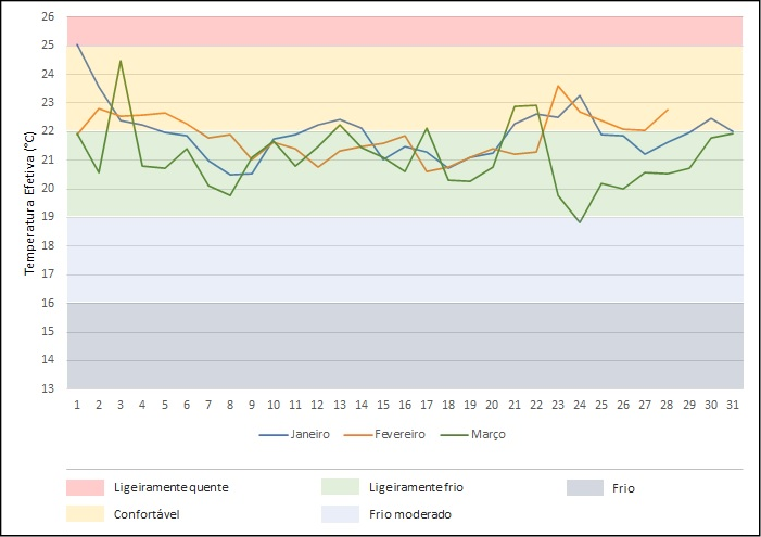 Os meses que se enquadraram na faixa de confortável, são os que fazem parte do período chuvoso da cidade, também sendo os meses com temperaturas mais altas (Tabela 2).