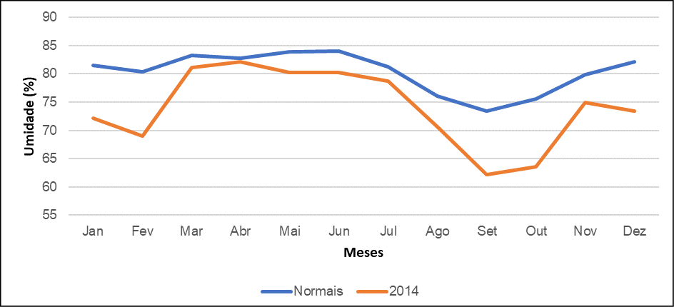 Comparando o comportamento da umidade relativa em 2014 com os dados das Normais Climatológicas de 1981 a 2010 do INMET (2020b) foi possível verificar que, apesar dos baixos índices de precipitação no ano de 2014, os valores de umidade relativa não divergiram tanto em relação à normalidade, apresentando uma diferença máxima de 11,9% no mês de outubro (Gráfico 8). Com isso, preservando valores mais amenos de desconforto térmico na análise a partir do índice de Temperatura Efetiva, visto que a equação utilizada considera temperatura e umidade relativa, é claro que essas variáveis climáticas são resultado de um conjunto de fatores, porém, nessa análise, a precipitação não indicou forte influência em intensificar o desconforto no período mais seco do ano, como esperado.