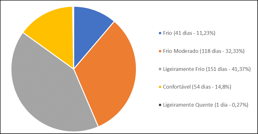 Avaliando de forma geral o comportamento do ano de 2014 na cidade de Viçosa em relação ao índice de Temperatura Efetiva, verifica-se que o ano ficou enquadrado em 5 faixas de sensação. A maioria dos dias ficou classificada em frio moderado e ligeiramente frio em todos os meses, ou seja, com sensação de 16,0 a 22,0°C e estresse fisiológico de ligeiro resfriamento do corpo e vasoconstrição (MAIA; GONÇALVES, 2002; GOBO, 2013; NEDEL et al., 2015).