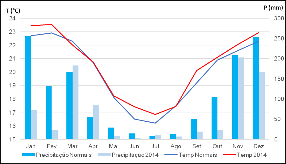 Avaliando o comportamento das temperaturas médias mensais das Normais (INMET, 2020b) em comparação com o ano de 2014, pode-se perceber valores um pouco mais altos na maioria dos meses de 2014, com exceção dos meses de março, abril e agosto, sendo que em março e abril o índice de precipitação mensal acumulada de 2014 excedeu os valores apontados pelas Normais. Além disso, os meses de janeiro, fevereiro, outubro e dezembro apresentaram valores de precipitação bem abaixo das Normais Climatológicas (Gráfico 4).