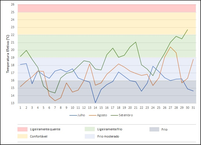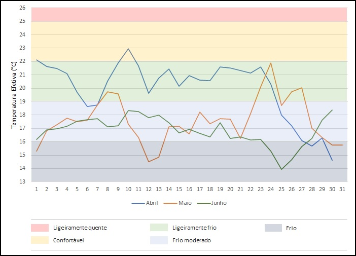 A partir dos resultados das análises, constatou-se que as temperaturas efetivas indicaram índices de desconforto térmico no município de Viçosa, sobretudo nos meses mais secos, nos quais a maioria dos dias se encaixa nas faixas de ligeiramente frio a frio moderado, causando estresse devido ao frio. Foram 118 dias do ano na faixa de frio moderado e 151 na faixa de ligeiramente frio, além de 41 dias na faixa de frio, totalizando 310 dias de desconforto térmico em relação ao frio, ou seja, 84,9% do ano.