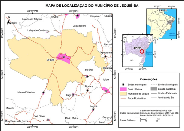 O município de Jequié está localizado na mesorregião do centro-sul da Bahia, mais precisamente no território de identidade do médio Rio de Contas, com latitude 13º51'50'' S, e longitude 40º04'54'' W (Figura 1). Possui uma população estimada em 155.966 habitantes, densidade demográfica de 48.33 km² e área territorial de 3.227,3 km² (SEI, 2019).