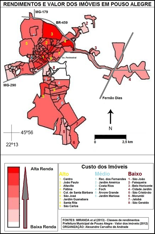 A localização das atividades produtivas (indústrias, comércios e serviços) e das formas de consumo do espaço urbano (moradia, por exemplo) em uma cidade capitalista, reflete os distintos potenciais de consumo dos moradores e dos investidores que se apropriam de parcelas dos espaços intraurbanos (SPOSITO, 2008). Devido a isto, o espaço se firmou como uma mercadoria, resultado de suas potencialidades para o trabalho, o consumo, o lazer e o morar, e determinadas áreas passaram a ter considerável valorização financeira, em parte por fatores econômicos, mas também por questões atreladas às intervenções políticas, e que são reflexos também de status sociais e de relações de poder (CARLOS, 2007). E isto é perceptível no espaço urbano de Pouso Alegre, conforme pode ser visualizado no mapa da figura 4, em que é demonstrada a divisão da cidade de acordo com os rendimentos de seus moradores e pelo valor imobiliário de bairros locais.