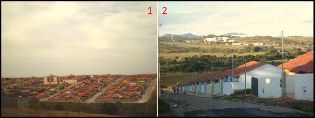 Figura 6 – Foto1: Conjunto Habitacional Santo Expedito. Foto 2: Rua no bairro Jatobá, tendo ao fundo o distrito industrial, às margens da Rodovia Fernão Dias