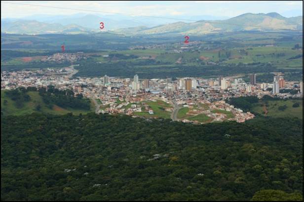 Figura 7 – A cidade de Pouso Alegre, e ao fundo o bairro Belo Horizonte (ponto 1), o Cidade Jardim (2), e a área urbana de Santa Rita do Sapucaí (3)