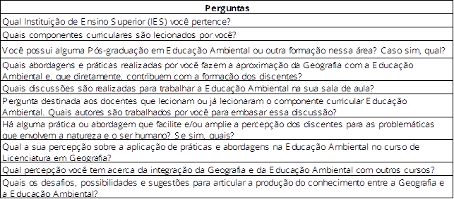 Feito isso, foi realizada a aplicação de um questionário semiestruturado, direcionado aos docentes dos cursos de Licenciatura em Geografia das instituições selecionadas. As perguntas, que podem ser observadas no quadro 1, disposto a seguir, procuram questionar os docentes sobre as abordagens realizadas por eles e a percepção desses profissionais sobre as práticas em EA.