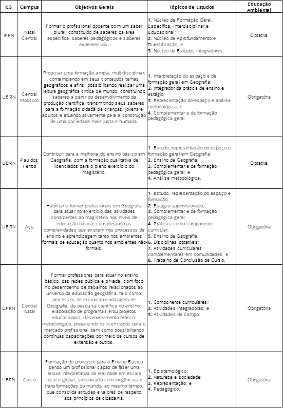 O componente curricular “Educação Ambiental” ou “Introdução à Educação Ambiental” é trabalhado no Programa Geral do Componente Curricular (PGCC) dos cursos de Licenciatura em Geografia de forma obrigatória na UERN, nos campi Mossoró e Açu; e na UFRN, nos campi Natal e Caicó. Entre as abordagens que esses campi trabalham, está a discussão sobre a epistemologia da Educação Ambiental, seus avanços e a exigência da temática nos dias atuais, conforme as leis ambientais. Além disso, também foi identificada, nos planos de curso, a utilização de metodologias que aproximam a realidade geográfica ao ensino.