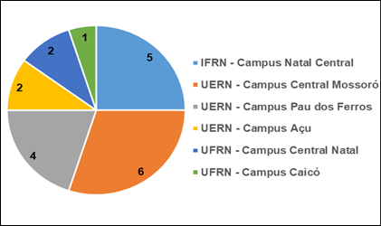 Dessa forma, identificou-se que os campi que ofertam os cursos de Licenciatura em Geografia e integram, entre seus componentes curriculares, a disciplina de EA estão: a UERN, campus Mossoró, Pau dos Ferros e Assú; a UFRN nos campi de Natal e Caicó; e, o IFRN, no campus Natal-Central. Portanto, a pesquisa se direciona a três campi localizados no interior do estado (Mossoró, Assú, Caicó) e dois na capital (Natal).