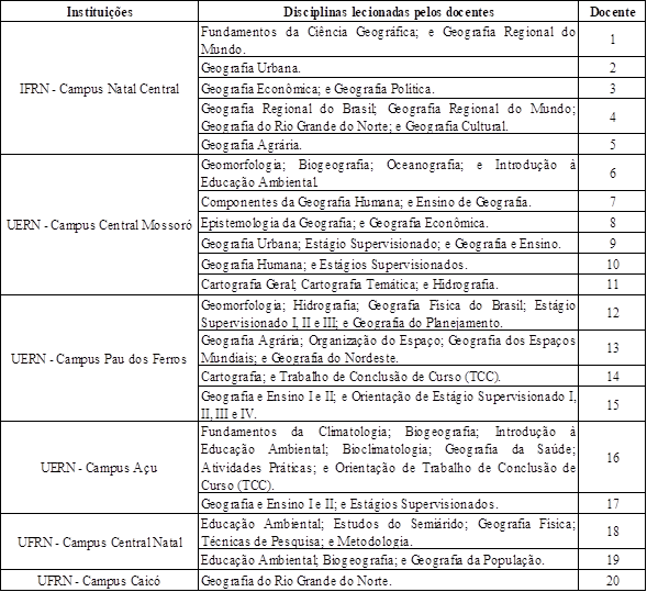 Os 85 docentes que, em 2021, integravam o corpo profissional dos cursos de Licenciatura em Geografia das IES públicas do Rio Grande do Norte estão divididos da seguinte forma em relação aos campi: 11 docentes do IFRN, campus Natal-Central; 13 docentes da UERN, campus Central-Mossoró; 10 docentes da UERN, campus Pau dos Ferros; 10 docentes da UERN, campus Açu; 24 docentes da UFRN, campus Central-Natal; e 17 docentes da UERN, campus Caicó. De todo o quantitativo apresentado, a pesquisa contou com a participação de apenas 20 docentes dos cursos de Licenciatura em Geografia (figura 2).