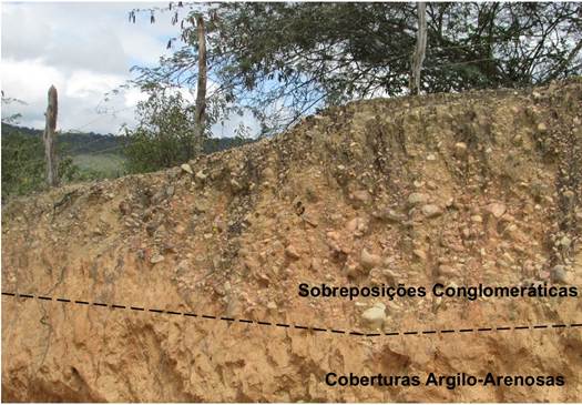 Figura 3 – Coberturas de solos residuais argilo-arenosos, com níveis de areia e argila compactas e sobreposições conglomeráticas