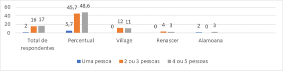 Os demais totalizaram três moradores do Renascer e três do condomínio Alamoana. Já os domicílios com duas ou três pessoas (além do respondente), totalizaram doze no condomínio Village, quatro no Renascer e dois no condomínio Alamoana. Deste modo, apesar da diferença do total de respondentes do Renascer e do Alamoana em relação ao Village, verificou-se uma distribuição praticamente homogênea no número de pessoas residentes nos domicílios pesquisados.