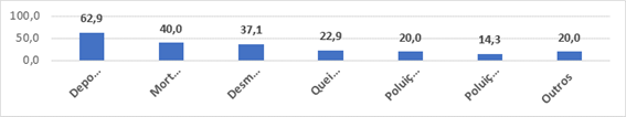 Na opção “Outro”, para livre preenchimento, cinco moradores do condomínio Village responderam não ter conhecimento de problemas ambientais, enquanto que outros dois indicaram a “queda de galhos grandes no condomínio, inclusive amassando um carro e quebrando o muro” (relato do entrevistado) e sobre o rio Mandacaru: “a considerar os rejeitos oriundos a montante, acredito que o rio já deve vir bastante poluído de João Pessoa” (relato do entrevistado).