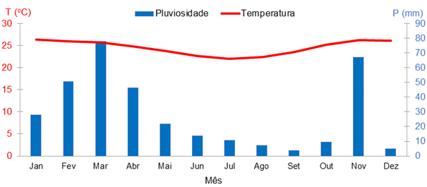 O município de Canudos localiza-se no norte do estado da Bahia (Figura 1), inserido na região Semiárida e na Área Susceptível à Desertificação (ASD). A alta temperatura, sempre acima dos 22,1ºC mensais, e a baixa pluviosidade anual (378,9mm) (Figura 2) conferem o caráter semiárido ao clima e um déficit hídrico em todos os meses. A concentração das chuvas entre fevereiro e abril e as estiagens pluviométricas nos demais demarcam a sazonalidade climática.