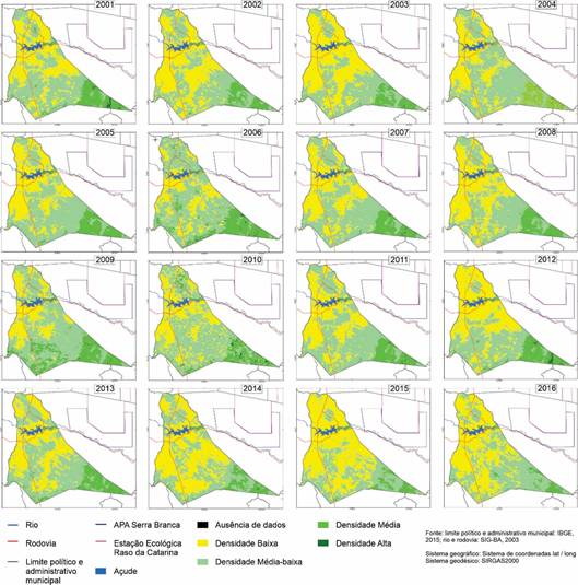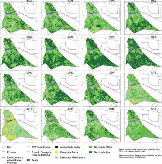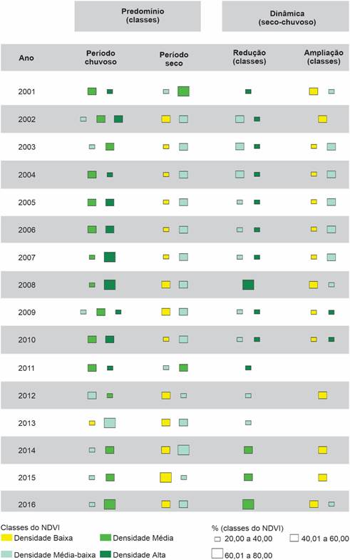 A variação do NDVI nas imagens MODIS pode encontrar-se entre 0 e 1, de modo que a proximidade do índice 1 indica maior densidade da biomassa. A definição do número e dos intervalos das classes do índice de vegetação (Tabela 1) considerou a relação entre densidade da biomassa e degradação ambiental, a ciclicidade do clima nos distintos anos e adequação dos intervalos às 32 cenas MOD13 utilizadas, já que corresponderam aos períodos seco e chuvosos dos anos de 2001 a 2016.