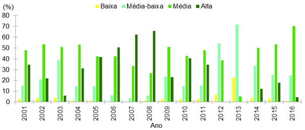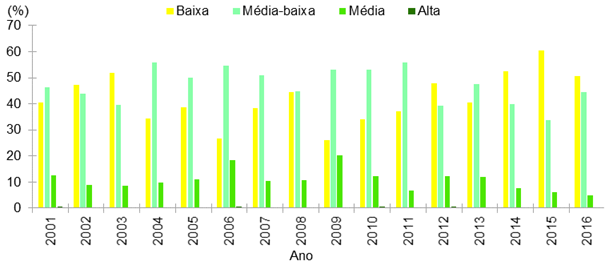Entretanto, ainda no período chuvoso, a distribuição média percentual da classe Densidade Média-baixa foi alta, por representar 23,93% do município, e a classe Densidade Baixa expressou 3,75% (Figura 4). Nos anos de 2012 e 2013, a classe Densidade Média-baixa foi preponderante (Figura 3), em função do fenômeno da seca (INPE, 2020), que alterou drasticamente a recomposição vegetal e a sucessão das plantações no período habitual. Verificou a classe Densidade Baixa em todo o período chuvoso, contudo os valores proporcionais fizeram-se inconstantes. Há anos em que eles foram relativamente altos, a exemplo do que aconteceu em 2002, 2003, 2009 e 2012 a 2015.
