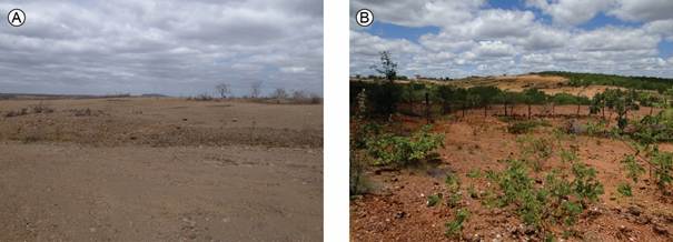 A sequência dos mapas de 2011, 2012 e 2013 é emblemática (Figura 3), porque possibilita uma análise relacional entre clima-solo-vegetação. A partir da sucessão do fenômeno da seca e da intensificação do déficit hídrico no solo, a densidade da vegetação diminuiu e o solo exposto se propagou intensamente, com a denotação da teia de relações ambientais na configuração da paisagem (Figura 5). Observa-se a sensibilidade da vegetação ao prolongamento das estiagens pluviométricas e a continuidade do solo exposto em meses fora do contexto temporal habitual. Isso quer dizer que o solo fica exposto às intempéries climáticas e pode decorrer no aumento da susceptibilidade ambiental à erosão, que constitui um grave fator que retroalimenta a desertificação.