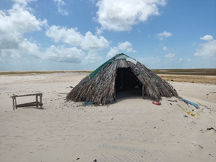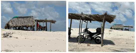 No processo de campo, foi observada uma estrutura que está diretamente associada ao desenvolvimento da atividade pesqueira no litoral, denominados de “carutos”, geralmente feitos de palha e madeira, como mostrado na Figura 8. Essas instalações temporárias servem como ranchos usados pelos pescadores para armazenar seus apetrechos de pesca, onde também eles descansam e cozinham durante o período que estão desenvolvendo a atividade pesqueira.