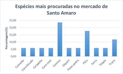 As espécies mais pescadas/compradas para revenda são: Corvina (16,13%), provavelmente das espécies Corvina uçú (Cynoscion microlepidotus) e Corvina Gó (Macrodon ancylodon), e a Tainha pitiu (16,13%) da espécie Mugil gaimardianus. Essas espécies também estão no topo das mais procuradas no mercado, Corvina (23,53%), Tainha pitiu (17,65%) e Traíra (11,76%) da espécie Hoplias malabaricus (Figura 10).