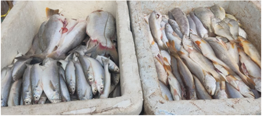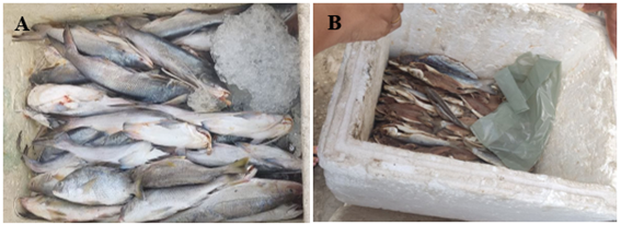 Figura 12 – Forma de tratamento do pescado para a venda no mercado municipal de Santo Amaro – MA. (A) pescado vendido sem nenhum tratamento. (B) pescado vendido eviscerado