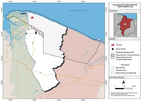Possuindo cerca de 1.582,80 km², o município de Santo Amaro está localizado na área oriental dos Lençóis Maranhenses, abrangendo parte do Parque Nacional dos Lençóis Maranhenses, Unidade de Conservação criada para preservar o extenso conjunto de dunas móveis intercaladas por lagoas de origem pluvial (Araújo et al., 2019). (Figura 1).