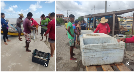 Figura 3 – Observação da atividade de despesca por pescadores residentes na comunidade da Travosa - A- e observação da venda de pescados no mercado municipal, localizado na sede – B