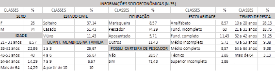 Grande parte (51,43%) dos entrevistados são casados, e na maior parte dos casos a pesca, ou as atividades conexas, ou de mariscagem são a única fonte de renda da família. A maior parte das famílias (57%) possui entre quatro a seis membros na mesma casa. Em dois casos, as famílias apresentaram mais de 10 membros, havendo mais de 8 filhos.