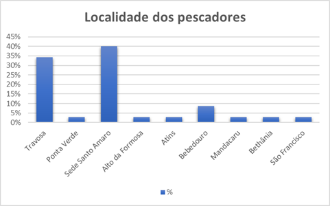 A respeito do local de moradia dos pescadores, 40% residem na Sede de Santo Amaro, 34% no povoado de Travosa, também foram identificados pescadores que moram nos povoados de Ponta Verde e Bethânia, que também pertencem ao município de Santo Amaro (Figura 4). Foi registrada a ocorrência de pescadores que deslocam-se de outras cidades para o município, exclusivamente para pescar, a exemplo dos pescadores que residem nos povoados de Mandacaru e Atins que pertencem ao município de Barreirinhas.