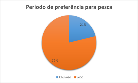 Os pescadores (79%) enfatizam que a preferência por pescar no período mais seco ocorre em virtude da diminuição das cotas dos rios, o que torna a captura mais eficiente uma vez que há uma maior concentração de peixes (Figura 6). Um percentual menor (21%) dos pescadores declara preferir pescar no período chuvoso, pois nessa época afirmam ter mais peixes, esses pescadores desenvolvem pesca em ambiente de água salgada.