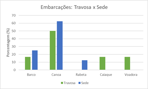 Cinco tipos de embarcações foram citadas nas entrevistas: caiaque, voadeira, rabeta, barco e canoa (Figura 7). Em relação às tipologias apresentadas, destacam-se a canoa a remo (Figura 8), e a canoa a pano. Ao comparar os tipos de embarcações usadas na sede com as embarcações usadas em Travosa, observou-se que caiaque e voadora não foram citados pelos pescadores da sede, por outro lado rabeta não foi citado pelos moradores de travosa.