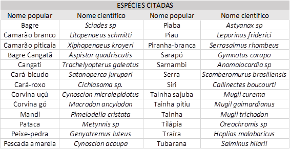 Em relação às espécies capturadas, foram citadas mais de 28 espécies. A espécie com maior ocorrência de captura na atividade pesqueira foi a Tilápia (Oreochromis sp.) com 21,15%, seguida da Traíra (Hoplias malabaricus) com 17,31%, ambas em ambientes de água doce, e o Camarão com 7,69%, das espécies Camarão Piticaia (Xiphopenaeus kroyeri) e Camarão Branco (Littopennaeus schimitti) de ambientes de água salgada.