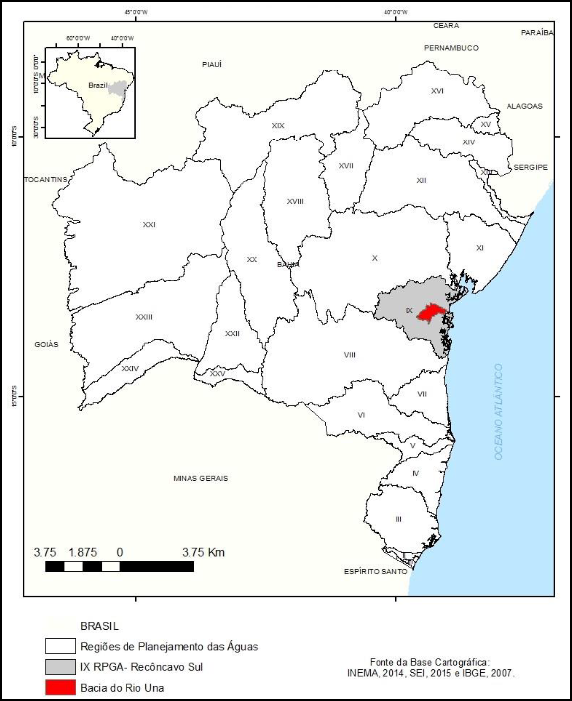 A IX RPGA (Figura 2) está situada entre as coordenadas 12º 30’ - 14º 55’de latitude Sul e 38º 55’- 40º 25’de longitude Oeste, compreende área total de 17.540 km2 e está quase inteiramente incluída na região do Baixo Sul do Estado da Bahia. Limitada ao norte e noroeste pela bacia do rio Paraguaçu e ao sul e sudoeste pelo rio de Contas. Esta é constituída por drenagens independentes que deságuam no Oceano Atlântico, na contra-costa da Ilha de Itaparica, do Arquipélago de Tinharé-Boipeba e na Baía de Camamu (Andrade 2015; Brasil, 1995).