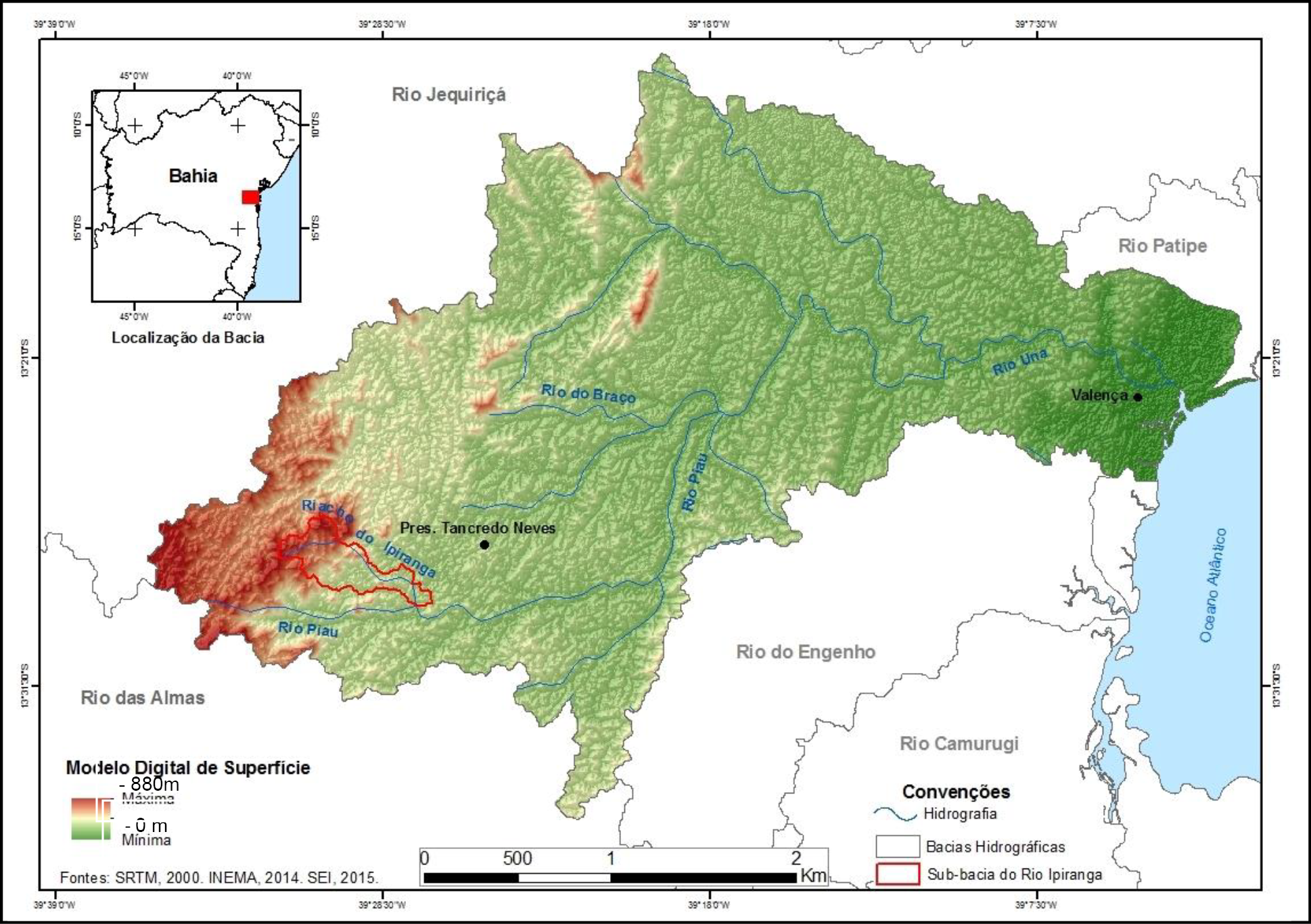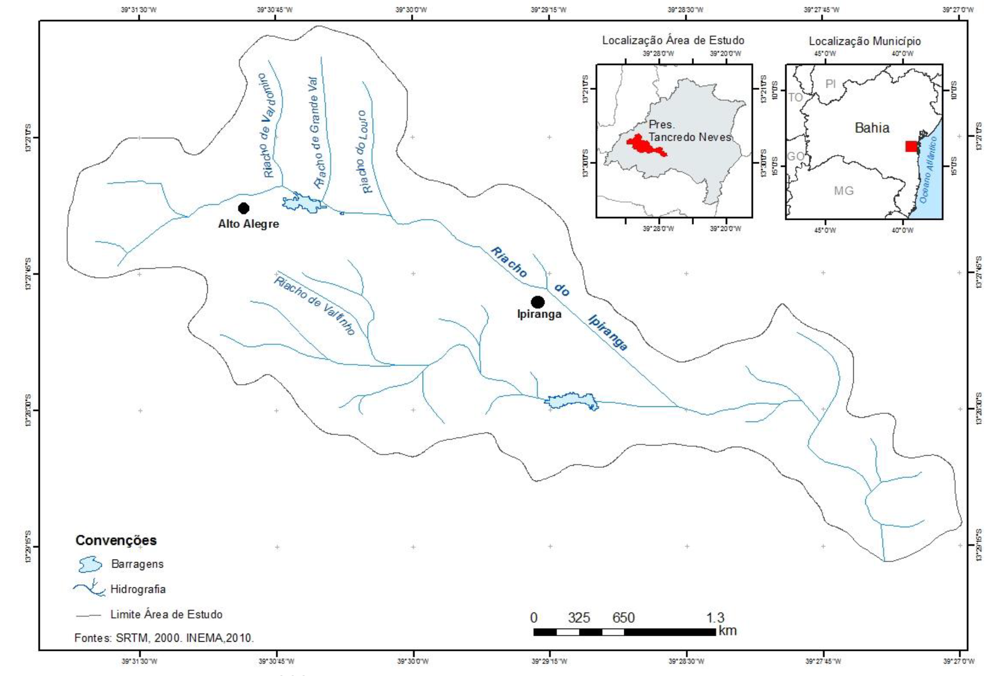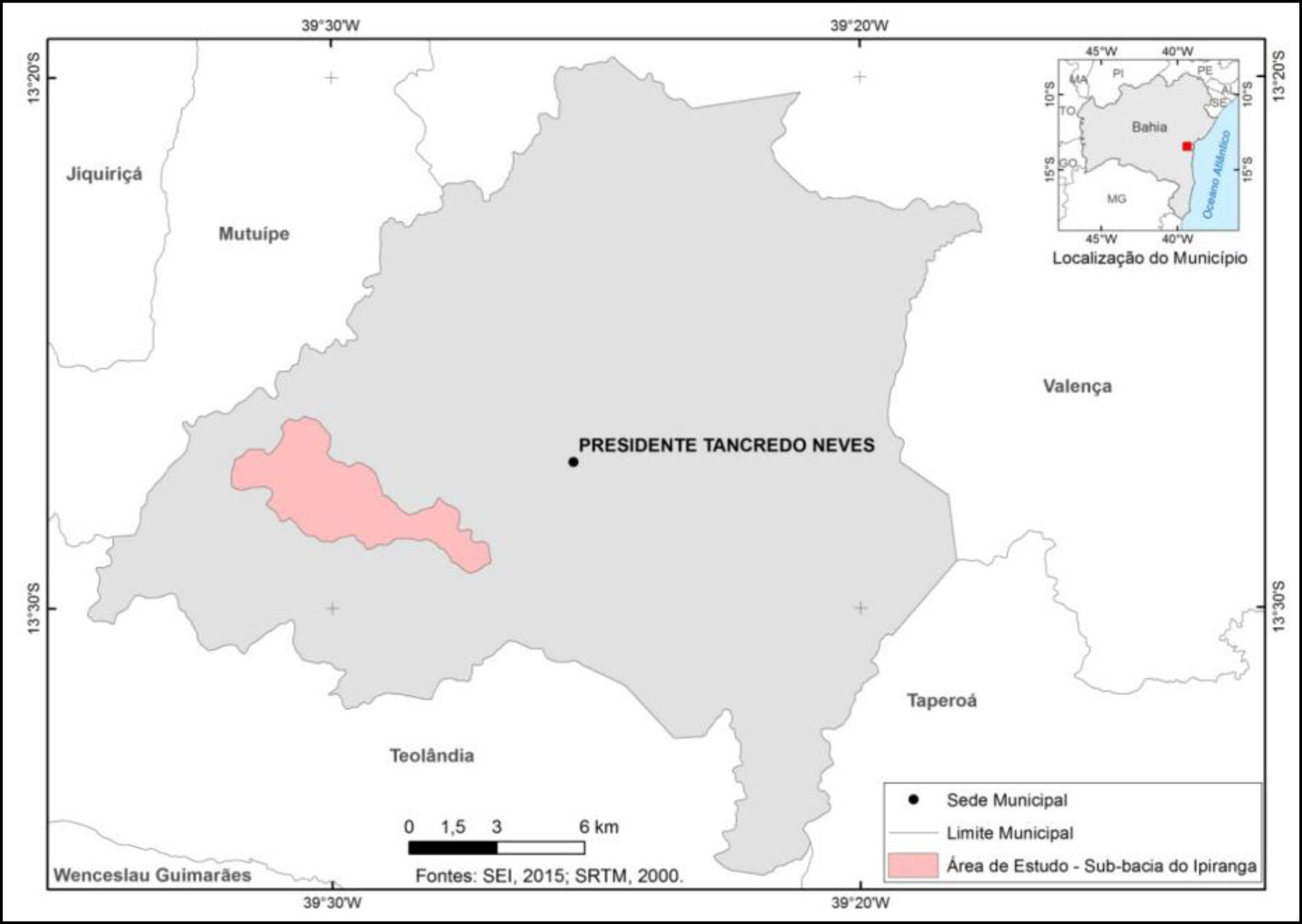 A Sub-Bacia do Riacho do Ipiranga (Figura 3), área de estudo deste trabalho, é tributária do Rio Piau, localiza-se na região rural do município de Presidente Tancredo Neves, Bahia, nas regiões rurais do Alto Alegre e Ipiranga, nas coordenadas, centro da área de estudo: UTM 445227 L/ 8512311 N. O Riacho do Ipiranga é o principal curso d’água da Sub-bacia, sendo que esta ocupa uma área de, aproximadamente, 2.027 ha.