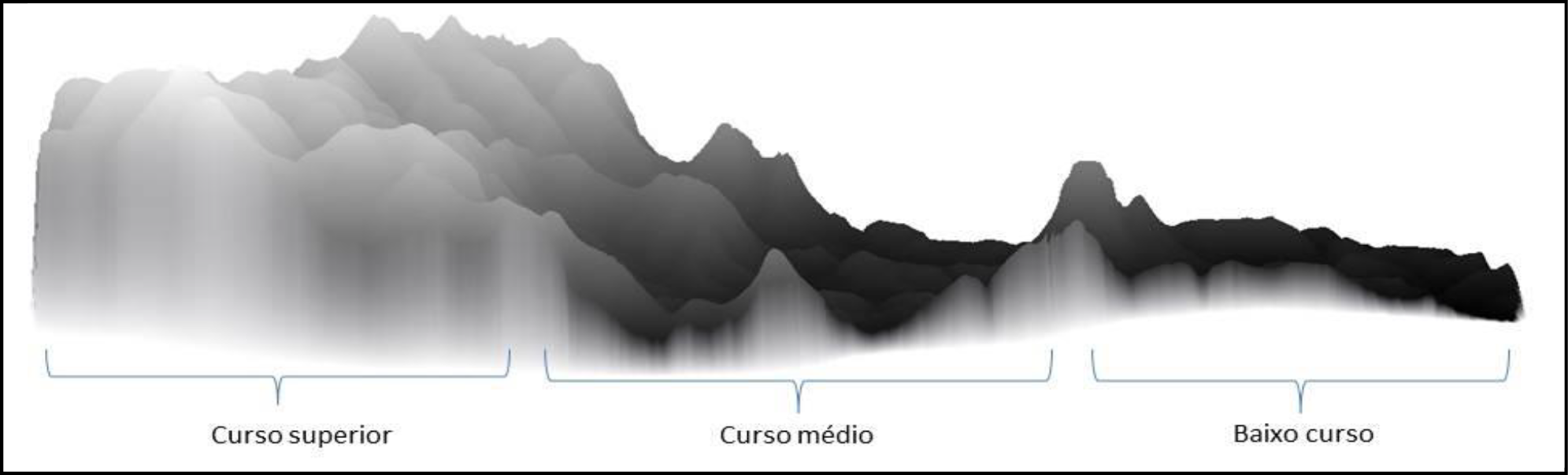 Na Sub-Bacia, observa-se a presença de três áreas distintas com características geomorfológicas e altimétricas bem definidas. No curso superior, as altitudes podem atingir até 720 metros, com uma altitude média de 570 metros. O relevo é bastante movimentado e dissecado, apresentando vales estreitos e agudos. Entre o alto e o médio curso da Sub-Bacia, há uma falha geológica com direção sudeste-noroeste (SE-NO), ou seja, orientada obliquamente no sentido que vai do sudeste ao noroeste. Nesse trecho, observa-se um desnível abrupto de aproximadamente 140 metros. No médio curso, as altitudes tornam-se mais modestas, em torno de 310 metros, com vales mais achatados e predominância de áreas planas no centro da bacia, cercadas por feições onduladas e fortemente onduladas. No baixo curso, as altitudes ficam em torno de 240 metros, com relevo ondulado, e na área da foz, o terreno é predominantemente plano. Essas diferenças geomorfológicas podem ser observadas de forma clara no modelo 3D da Sub-Bacia (Figura 6) e no perfil longitudinal (Figura 7).