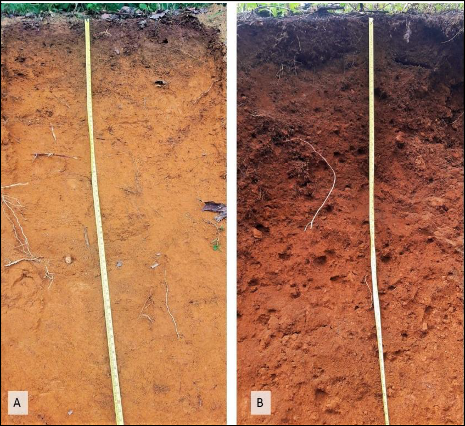 A imagem A evidencia um perfil de Latossolo Vermelho-amarelo distrófico na parte média da Sub-Bacia. A imagem B evidencia um Argissolo vermelho na parte superior da Sub-Bacia.