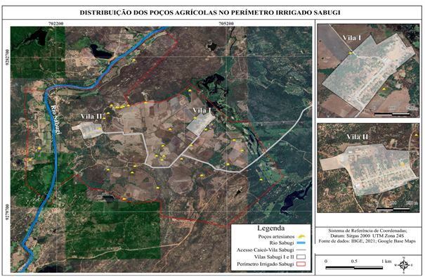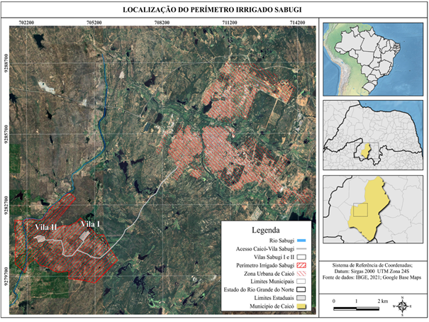 O Perímetro Irrigado Sabugi está localizado no sudoeste do município de Caicó, no interior do Rio Grande do Norte (Figura 1), o qual foi construído no bojo das políticas públicas de “combate à seca” no decorrer dos anos 1970. Esta área compreende duas agrovilas, onde, conforme relatos orais da equipe de saúde local em 2023, residiam 227 indivíduos distribuídos entre as agrovilas Vila I e Vila II, além de áreas adjacentes que englobam lotes e terras cedidas pelo Dnocs dentro do perímetro irrigado. Do ponto de vista climático, o local apresenta características semelhantes às demais regiões do município, com uma temperatura média anual de 28,3°C e uma precipitação média anual de 629 mm, concentrada principalmente de janeiro a maio Inmet (2022).