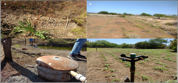 Nesse cenário, das obras hídricas implementadas pelo Dnocs como parte dos esforços de “combate à seca”, apenas as estruturas de armazenamento de água, como as caixas de água das vilas e a barragem, continuam em uso pelos colonos para o abastecimento hídrico, embora agora sejam empregadas de maneiras diferentes e para fins além dos originalmente previstos pelo órgão. As instalações de irrigação e drenagem que anteriormente sustentavam a agricultura estão atualmente abandonadas e em estado de deterioração (Figuras 2A e 2B). Quanto aos métodos de produção, os agricultores tiveram que se adaptar à escassez hídrica adotando novas técnicas, como a perfuração de poços (Figura 2C) e a irrigação por bombeamento (Figura 2D) diretamente do rio Sabugi, especialmente em áreas próximas ao curso d'água.