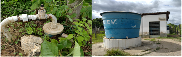 Adicionalmente, em contraste com a Vila II, na Vila I, durante a década de 1990, um poço tubular foi perfurado (Figura 4A) e desde então tem mantido uma vazão adequada para atender às necessidades atuais da referida vila. Por meio deste poço, a água é bombeada e encanada para as residências. Além disso, um dessalinizador (Figura 4B) também foi implementado no mesmo período, o qual fornece água potável para consumo das famílias Santos (2016).