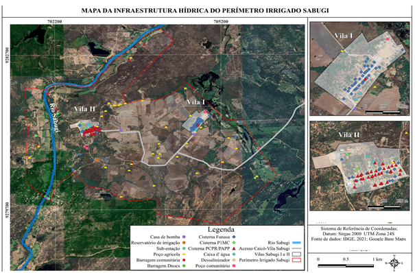 Tal infraestrutura hídrica inclui, atualmente, 33 poços agrícolas, 95 cisternas, 2 barragens, 1 reservatório de irrigação, 4 reservatórios de abastecimento residencial, 3 casas de bombas, 1 subestação, 3 poços comunitários e 1 dessalinizador. Essa diversidade indica uma variedade de fontes e técnicas para captação, armazenamento e distribuição de água, proporcionadas a partir de uma convergência de distintas políticas públicas, em diferentes momentos desde 1970. Portanto, o mapa da infraestrutura hídrica do perímetro, ilustrado na Figura 8, não reflete apenas a diversidade de fontes e métodos de captação de água, mas também evidencia a interação dinâmica entre as políticas públicas, as necessidades da comunidade e os recursos disponíveis.