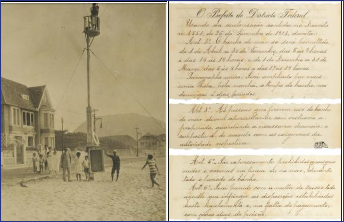 Nesse âmbito, convém destacar o posto de observação para vigilância das práticas sociais na Praia de Copacabana e o Decreto nº 1.143 de março de 1917 (Figura 6), em que consta que só seriam permitidos os banhos das 5h às 9h e das 16h às 18h de 1º de abril a 30 de novembro de 1917. Já entre 1º de dezembro de 1917 e 31 de março de 1918, o banho era permitido das 5h às 8h e das 17h às 19h. Aos domingos e feriados, havia uma flexibilização um pouco maior. Como pena ao não cumprimento, era aplicada uma multa de 20 mil reis ou 5 dias de prisão (Schmidt, 2017).