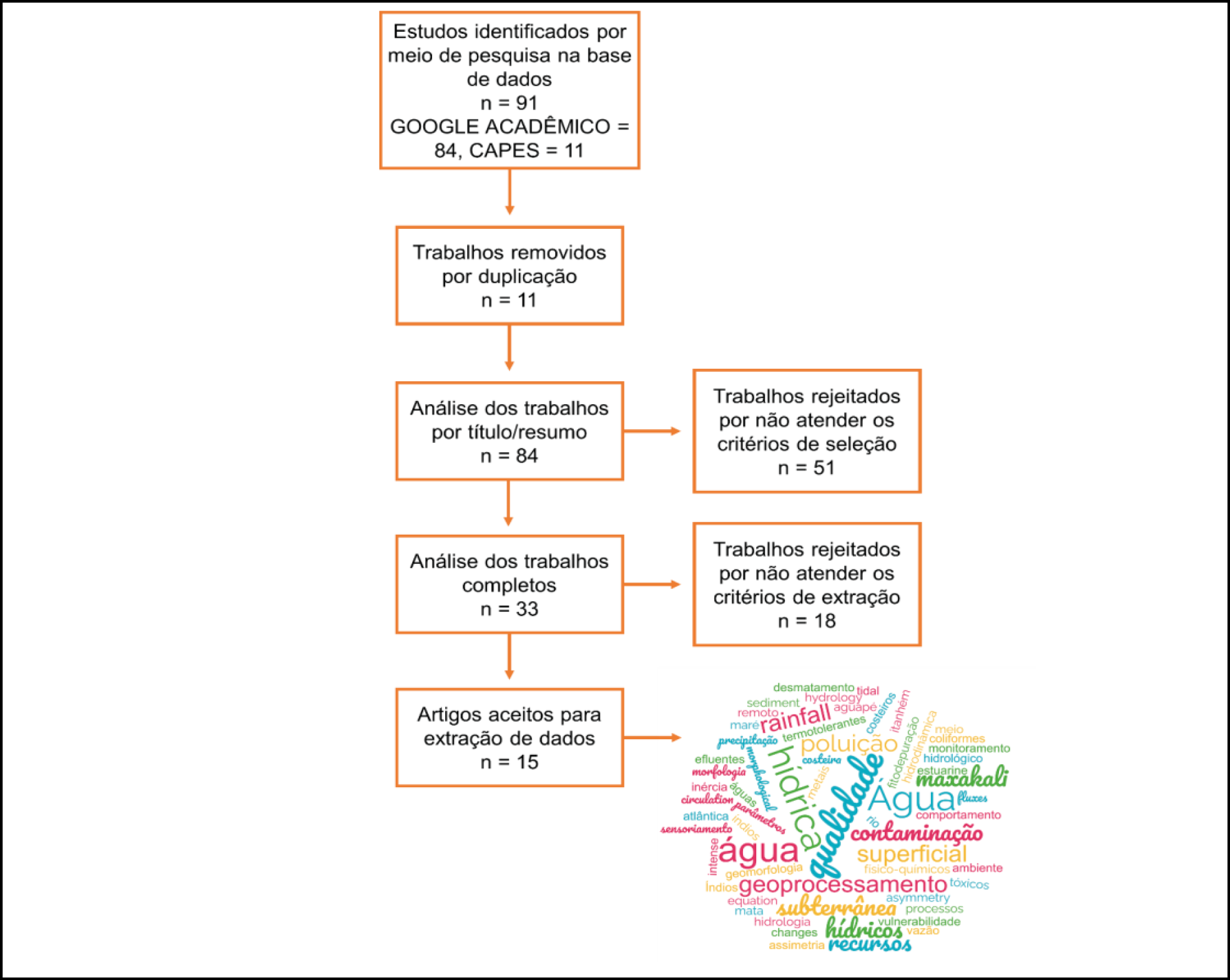As strings foram buscadas em 6 bancos de dados, mas apenas 2 bancos de dados contribuíram para a pesquisa. Assim, foram identificados 91 estudos utilizando a string, sendo que destes, 84 trabalhos foram identificados no Google Acadêmico (88%) e 11 trabalhos foram identificados no Periódico da CAPES (12%) (Figura 2). Destes, 11 foram removidos por duplicação, sendo então realizada a análise de 84 trabalhos pelo título, resumo e palavras-chave. Após esta análise foram rejeitados 51 trabalhos por não atenderem aos critérios de seleção, sendo excluídos trabalhos que não estavam alinhados com o objetivo desta revisão e trabalhos secundários (resumos, teses, dissertações dentre outros). Dos 33 trabalhos restantes, 18 foram rejeitados por não atenderem os critérios de extração, restando 15 artigos para extração dos dados (Figura 2, Quadro 1). Destes 15 artigos aceitos para extração de dados, foi gerado uma nuvem de palavras considerando a frequência que as palavras apareceram nos artigos. Assim, pode-se observar que as palavras que aparecem com maior frequência são: água, qualidade, hídrica, geoprocessamento, contaminação, entre outros (Figura 2).