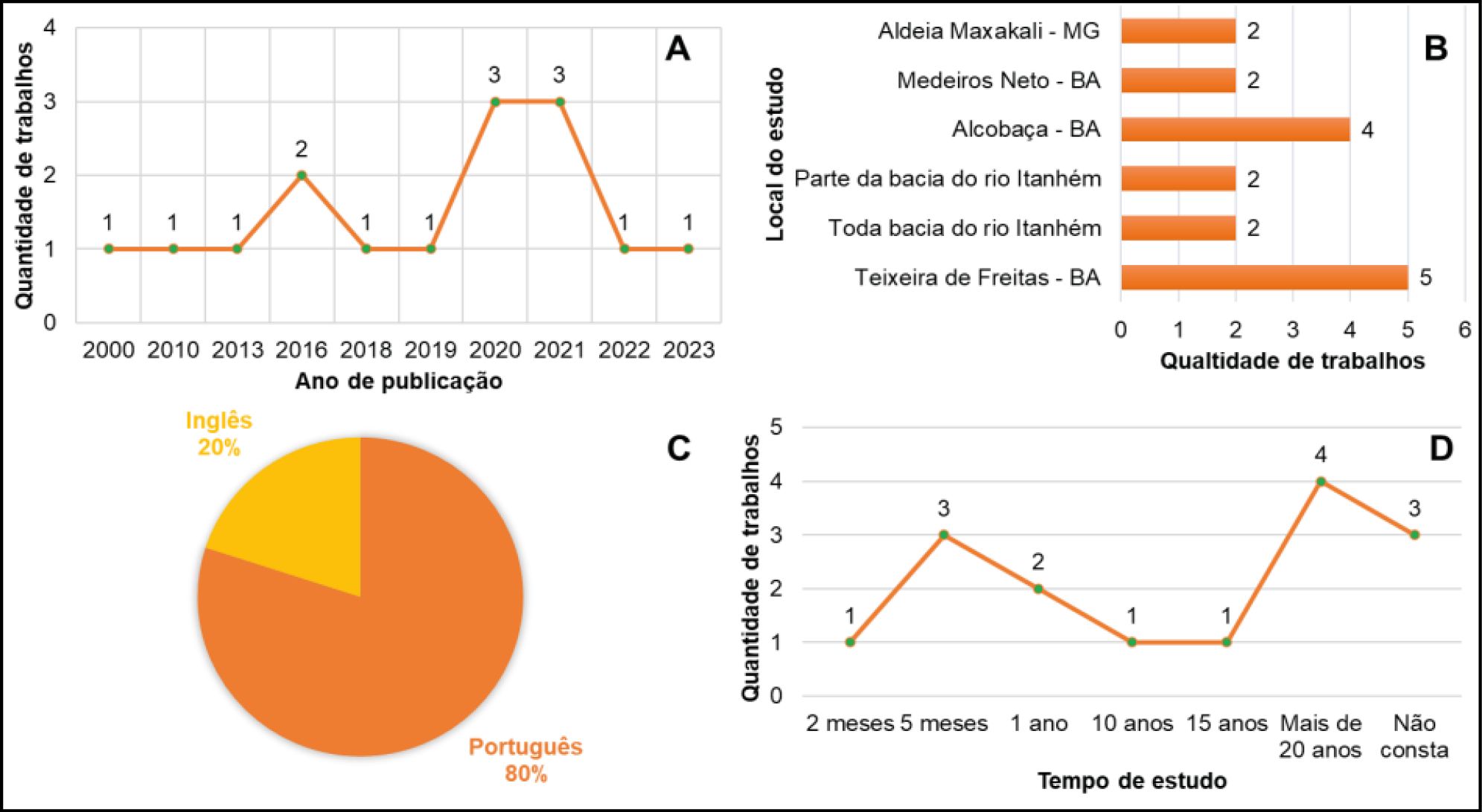 Foram extraídos dados com relação ao ano de publicação, local de estudo, idioma e tempo de estudo destes artigos. Assim, verifica-se que as pesquisas sobre o rio Itanhém se tornaram mais frequentes no ano 2016 a 2021, com maior número de publicações em 2020 e 2021 (Figura 3A). Verifica-se também que a maior parte dos estudos do rio Itanhém estão concentrados na cidade de Teixeira de Freitas – BA e Alcobaça – BA (Figura 3B e Figura 4). Além disso, os idiomas dos trabalhos estão em grande parte publicados em português, representando 80% do total, sendo apenas 20% em inglês (Figura 3C). O tempo de estudo em sua maior parte estavam com mais de 20 anos de pesquisa (Figura 3D).