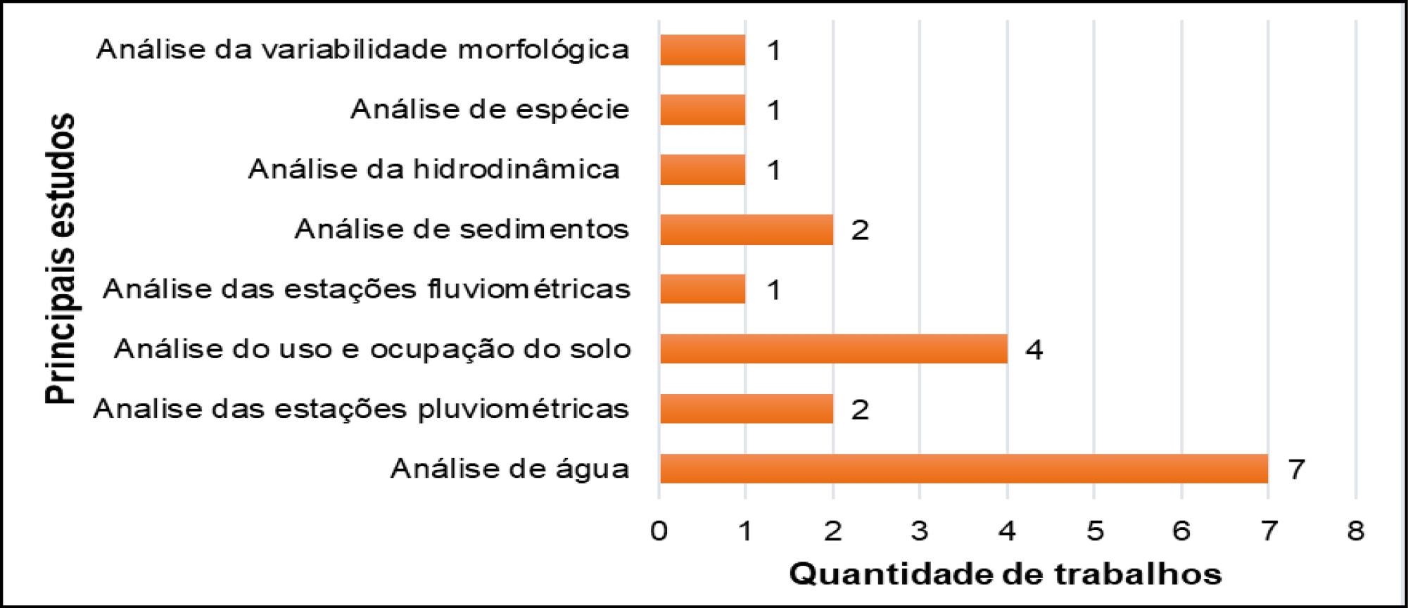 A maioria dos estudos sobre o rio Itanhém estão concentrados na área de análise de água, totalizando 7 trabalhos (46,6%). Têm-se também análise do uso e ocupação do solo com 4 trabalhos e análise de sedimentos e estações pluviométricas com 2 trabalhos cada (Figura 5).