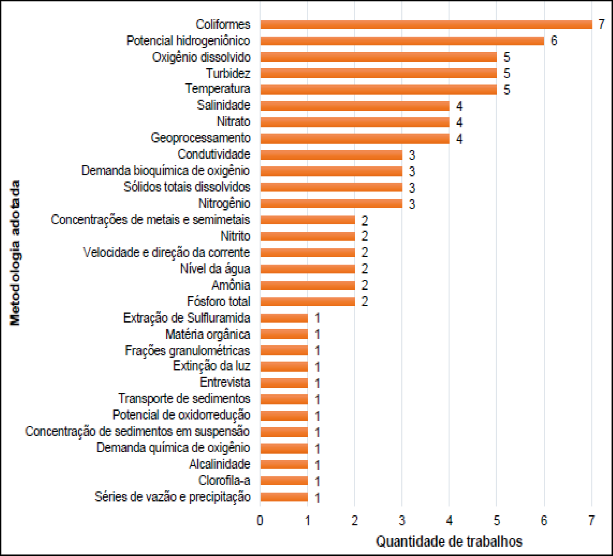 A maioria das metodologias adotadas nos trabalhos publicados sobre o rio Itanhém são: análise de coliformes (7 artigos), potencial hidrogeniônico (pH) (6 artigos) e oxigênio dissolvido, turbidez e temperatura (5 artigos cada), corroborando que os principais estudos sobre o rio Itanhém estão concentrados na análise de água (Figura 6).